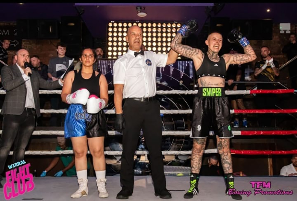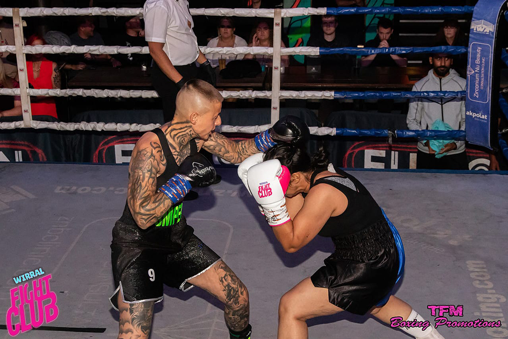 As Storm Amy battered the North West of England last weekend causing carnage and massive travel disruption in it’s wake TFM Boxing Promotions’ glamorous head honcho Mollie Edgington travelled from her base in Southend-on-Sea on the South coast to Liverpool where she had joined forces with Wirral Fight Clubs’ Sean Keshahoya to present an all action night of of International professional boxing at the Fusion Night Club.