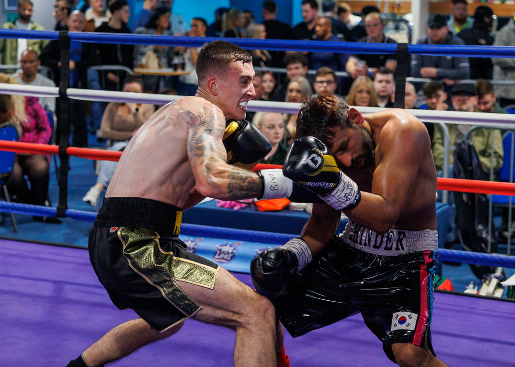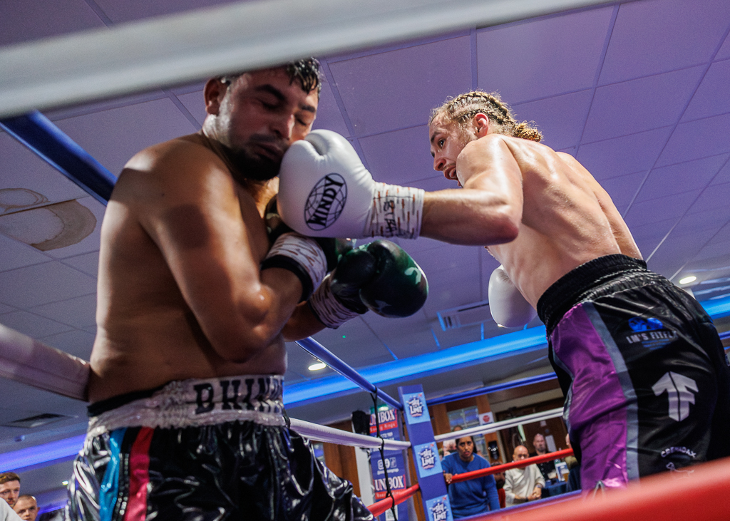 Next up, and undoubtably Fight of the Night, was local lad Leon Kellett (1-0-0) against Bhairupa, India’s Bhinder Singh (1-6-0).